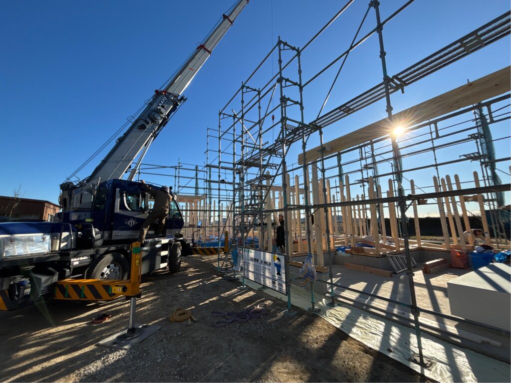 こちらのお家は延床面積も約80坪近いお家なので、上棟も2日間かけての