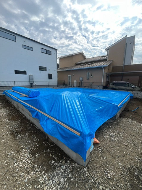 土台敷きが完了すると、このようにしっかりブルーシートを敷いて雨養生をします!