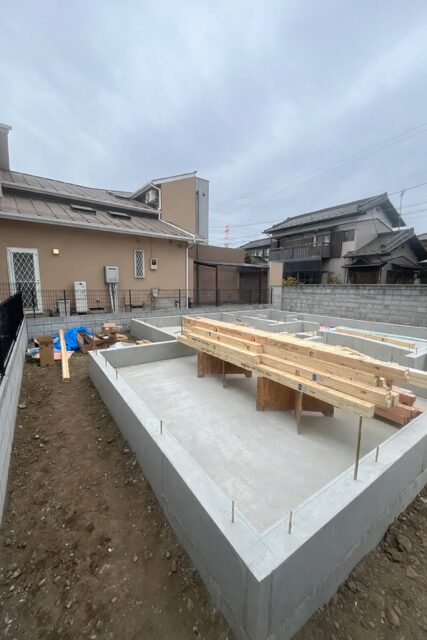 基礎工事と配管工事が無事終了して次は「土台敷き」が始まります!