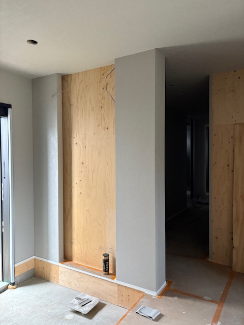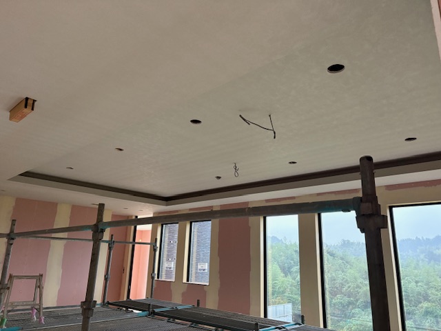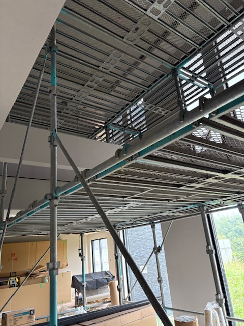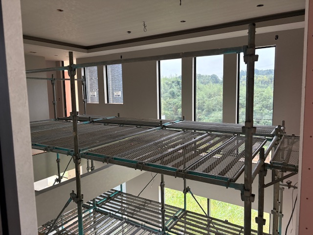 大きな吹き抜けには施工に必要な足場を立てて作業します‼