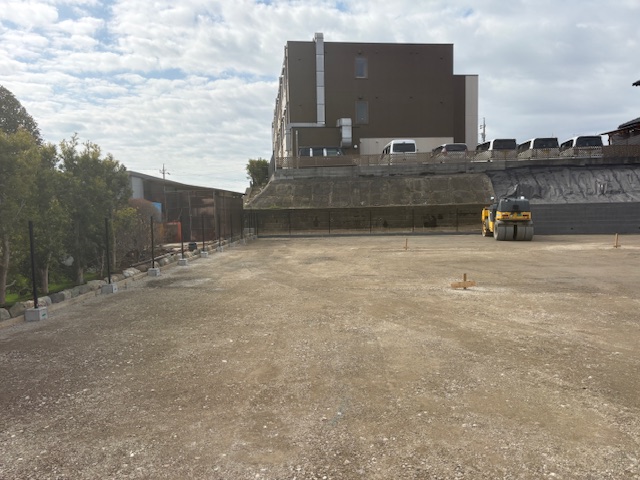 土の高さを調整しながら整地してアスファルトの舗装の下地を作ります!