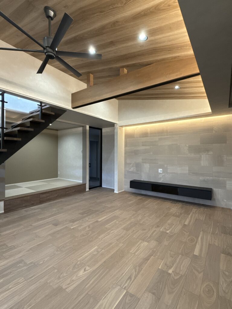 壁を出しながら間接照明を施しているので、落ち着いた明るさの中でゆっくりテレビを見たり団らんしたりと、ゆったりとしたひと時を過ごすことができます(^^♪