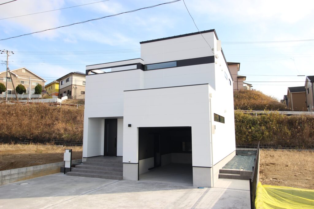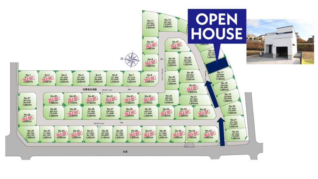 2ヶ所ある分譲地の入り口の、南側のほうから入ってまっすぐ行くと、今回の白いガレージハウスが見えますのでこちらまで直接お越しください!