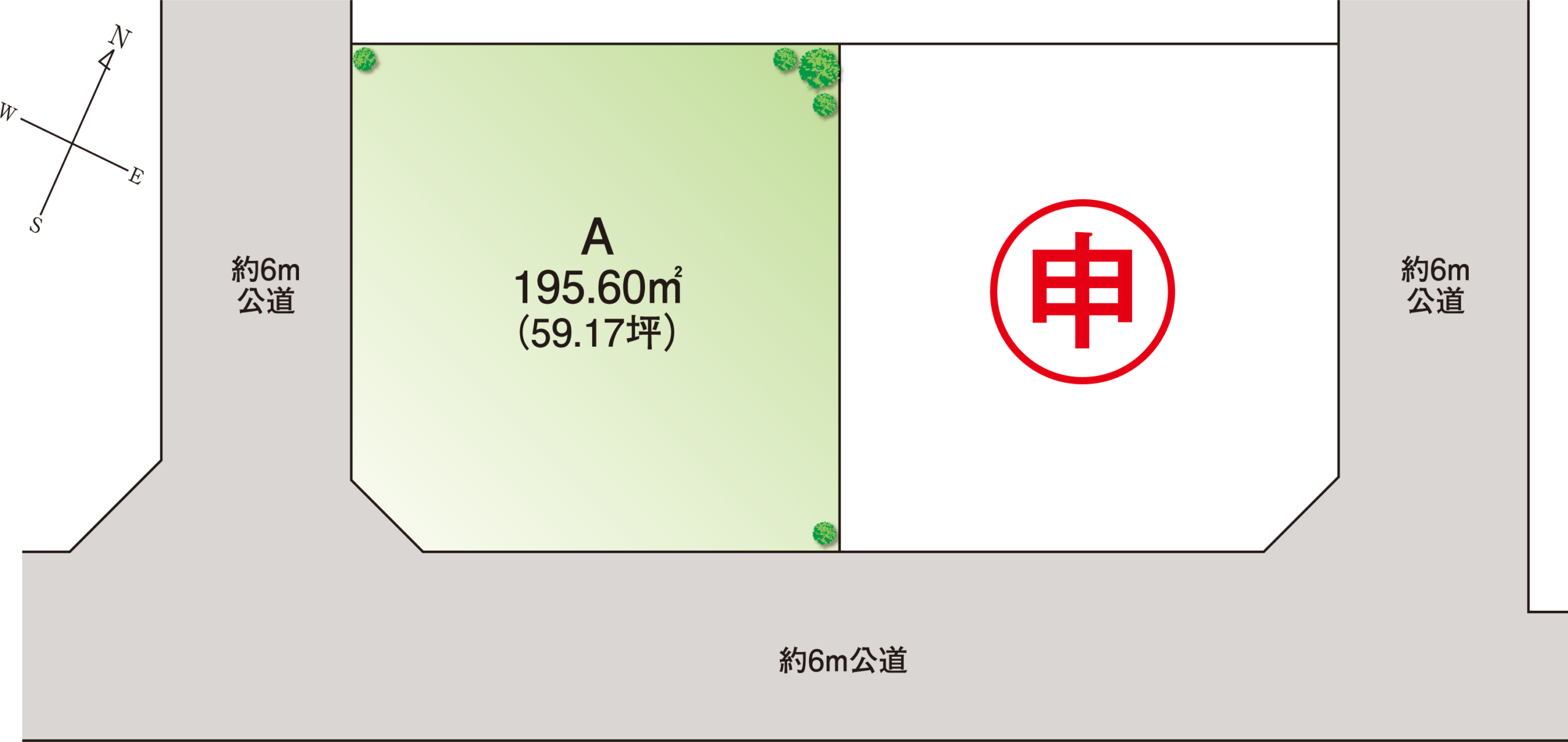 | 総区画数 | 2区画 | 接道 | 南東側約6m公道、南西側約6m公道、北東側約6m公道にそれぞれ接道 |
