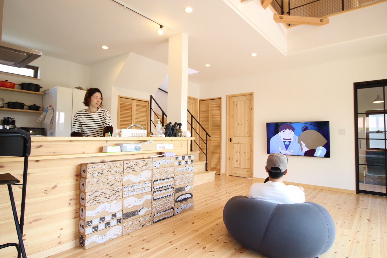 奥様:無垢材と広い空間づくりにこだわりましたね。見た目にも柔らかい雰囲気の家にしたいと決めていたので、床や建具など一通り無垢材を使用して施工してもらいました。広い吹き抜けや2階のスペースも含めて最初にイメージしていたような室内になったので満足しています。