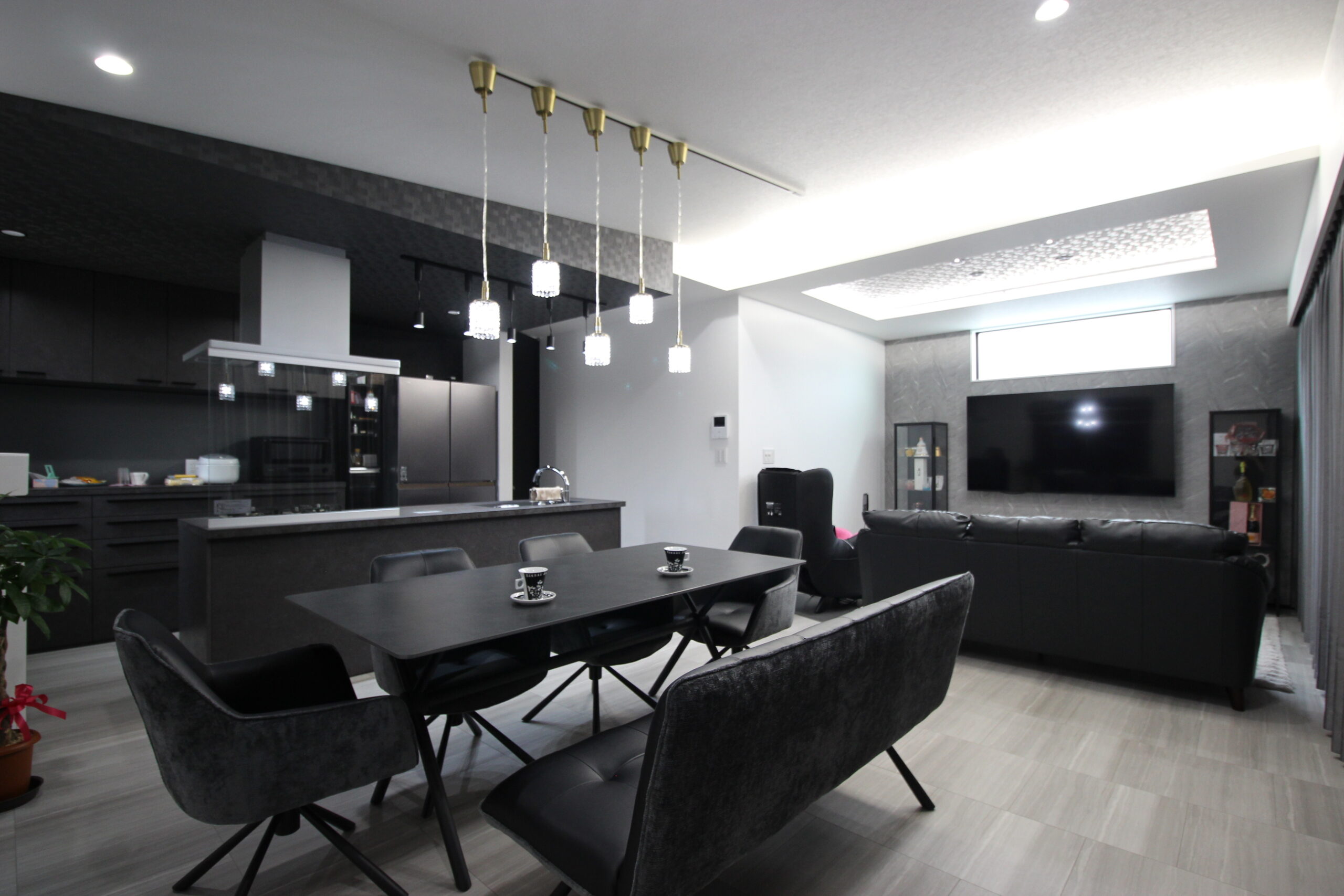 キッチンなどの設備のカラーやクロスのカラーを決めて、そこに合わせるように後々家具を揃えていき、これだけの統一感のある空間に仕上げています。