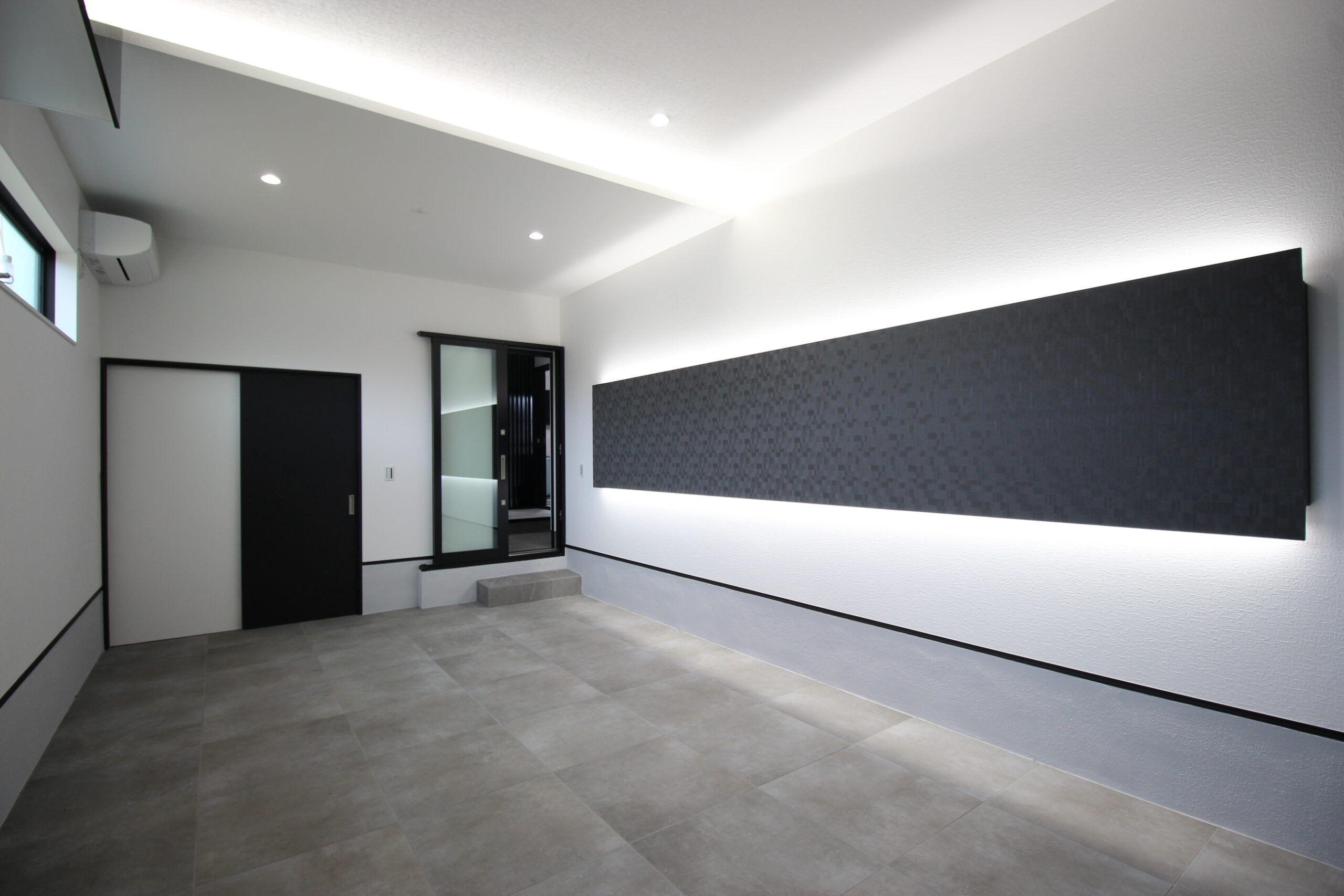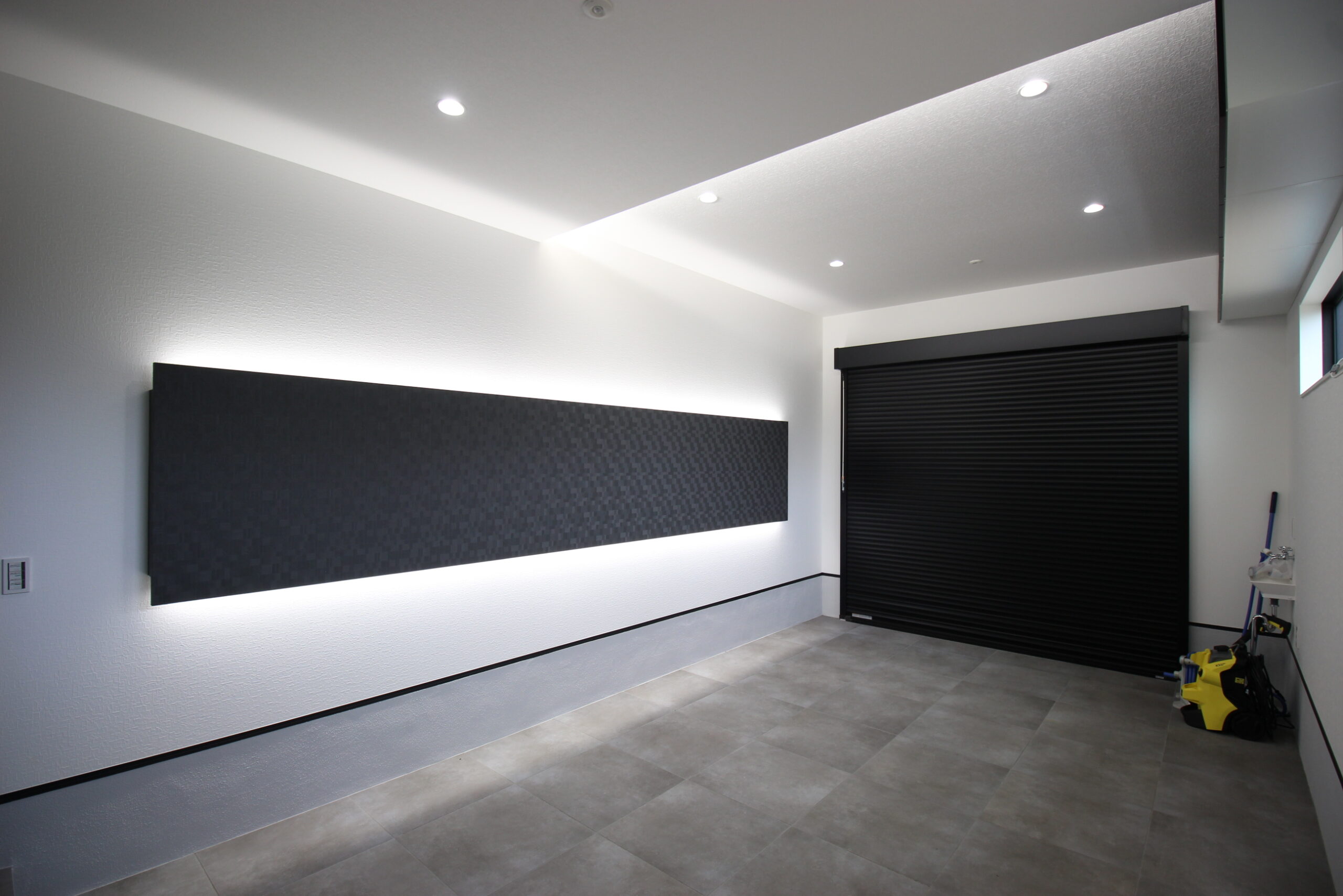 こちらの広いガレージは、室内のデザインに合わせてモノトーンにコーディネートして間接照明を施しました。