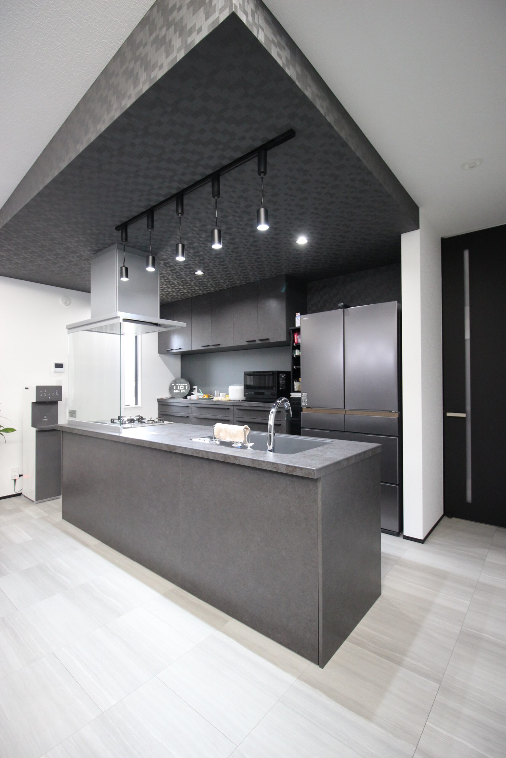 天井の傾斜を感じさせないよう、キッチンの上部は折り下げ天井にしてブラックのクロスで覆い、意図的に立体感のある空間に。