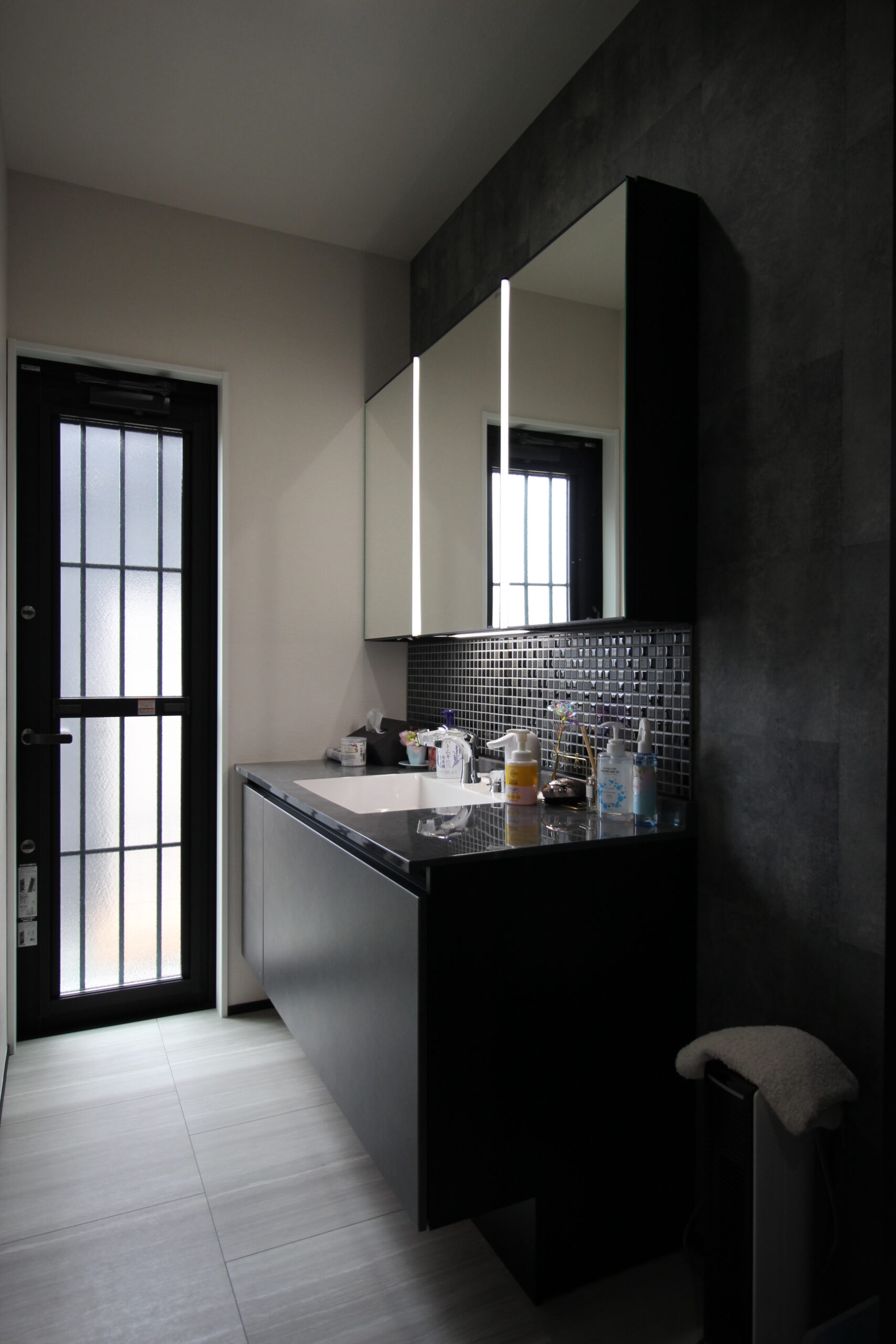 1階の洗面化粧室も、室内の雰囲気そのままの、ブラックを基調としたとてもカッコいいモデルを採用いただきました。