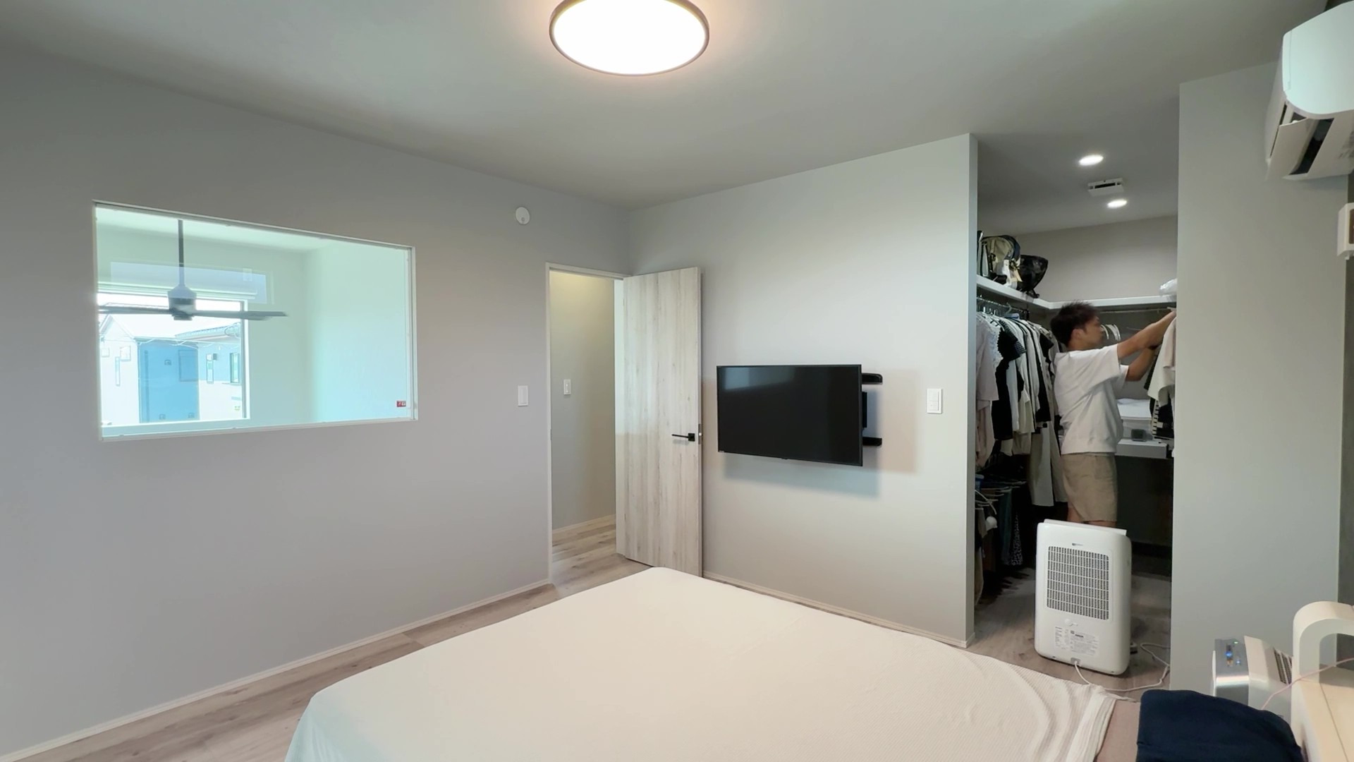 ランドリールームのおかげで平日は1階で完結できるため、休日用のご夫婦の衣服は主寝室に併設したウォークインクローゼットにまとめています。