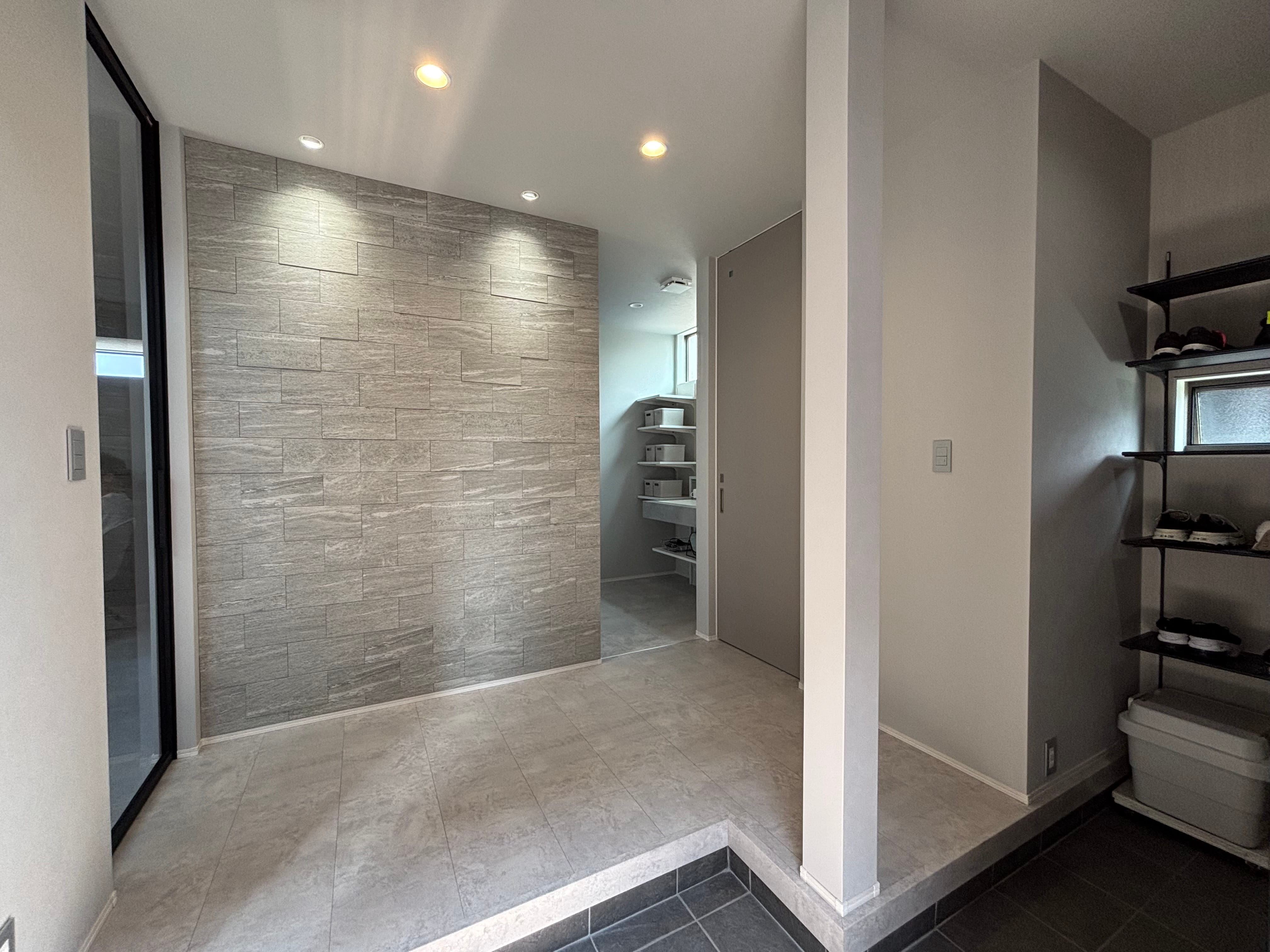 ご主人:エントランスのエコカラットはこだわらせてもらいました。玄関ドアを開けた最初に見える顔なので、ここは絶対にカッコよくしたいと最初からイメージしていましたね。フロアや建具にも合う、空間で統一感も出るストーンデザインのエコカラットを壁一面に施工したので、家に来てくれた人はみんな驚いてくれますね!ここは妥協しなくて本当に良かったです。