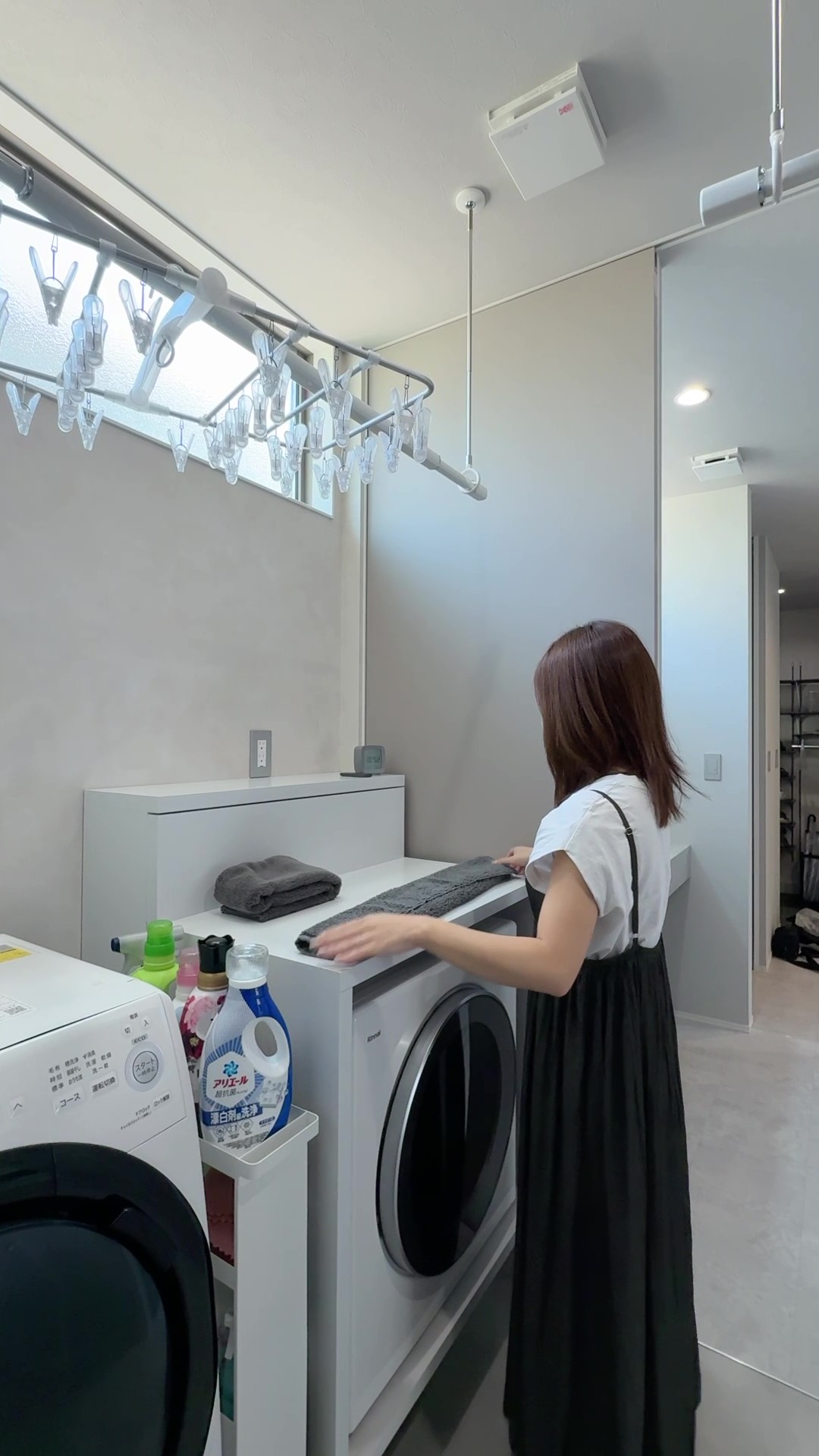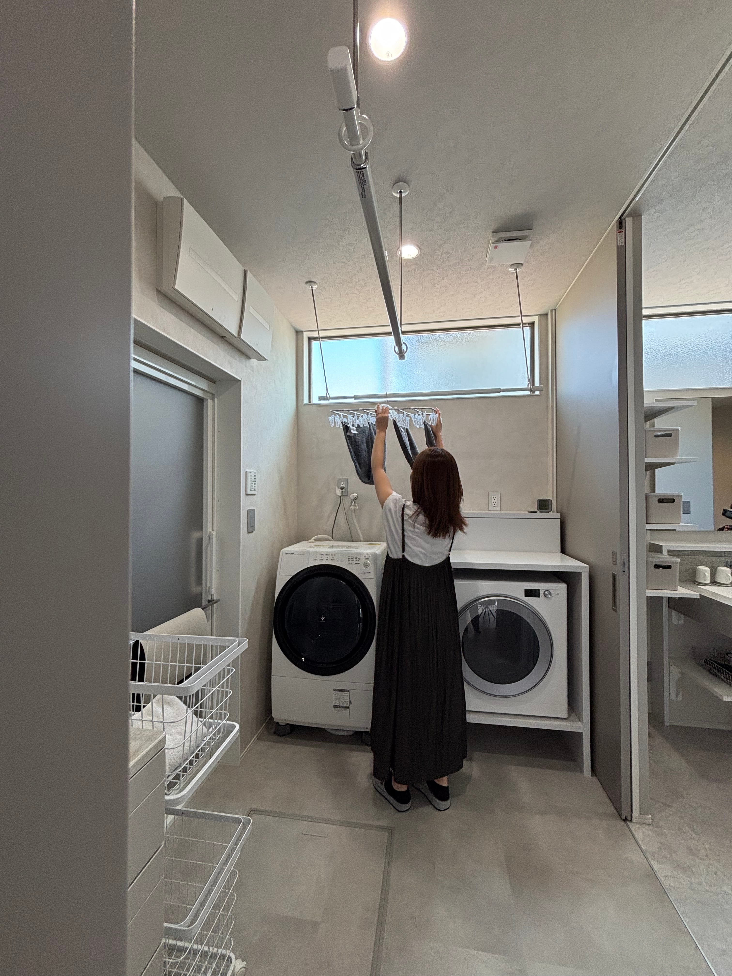 洗濯機から取り出してすぐに乾燥機に移せる配置にし、また天井からの物干しも活用して、この部屋で乾燥から収納まで完結できるようにしました。