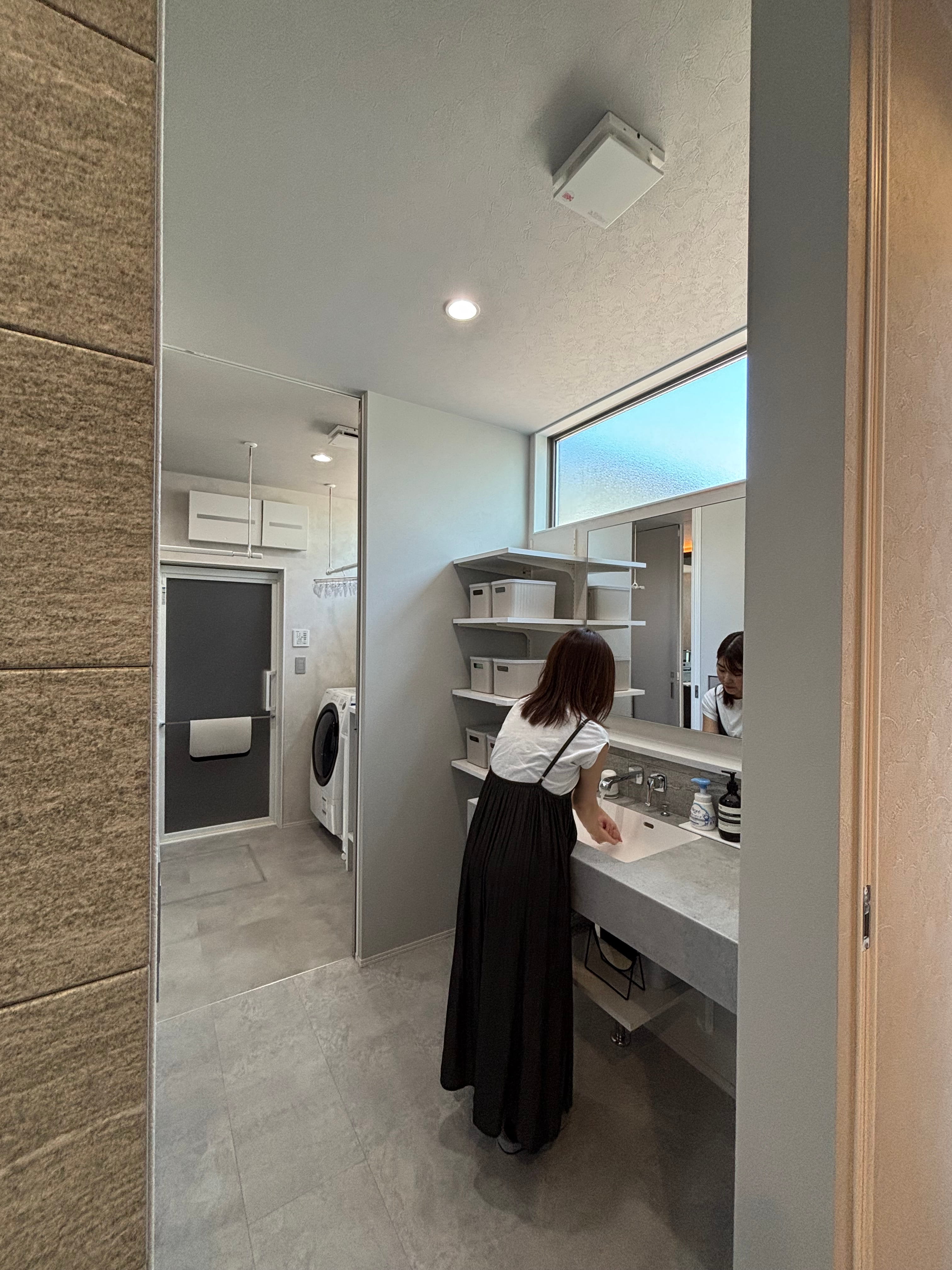 化粧台もワイドですが、空間も広げて収納スペースを確保したことで、日用品などこのストレート動線で使用するものを一式ストックしておくことができます。